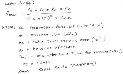 Maximum radar range can also be calculated using the following radar equation:
