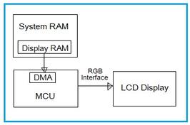 Explore the advantages and disadvantages of using the RGB display interface for image transfer in LCD displays, including its signals and limitations.