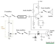 Squelch is a circuit in radio receivers that mutes the audio output when there's no desired RF signal. It blocks noise, allowing audio only when a valid signal is detected.